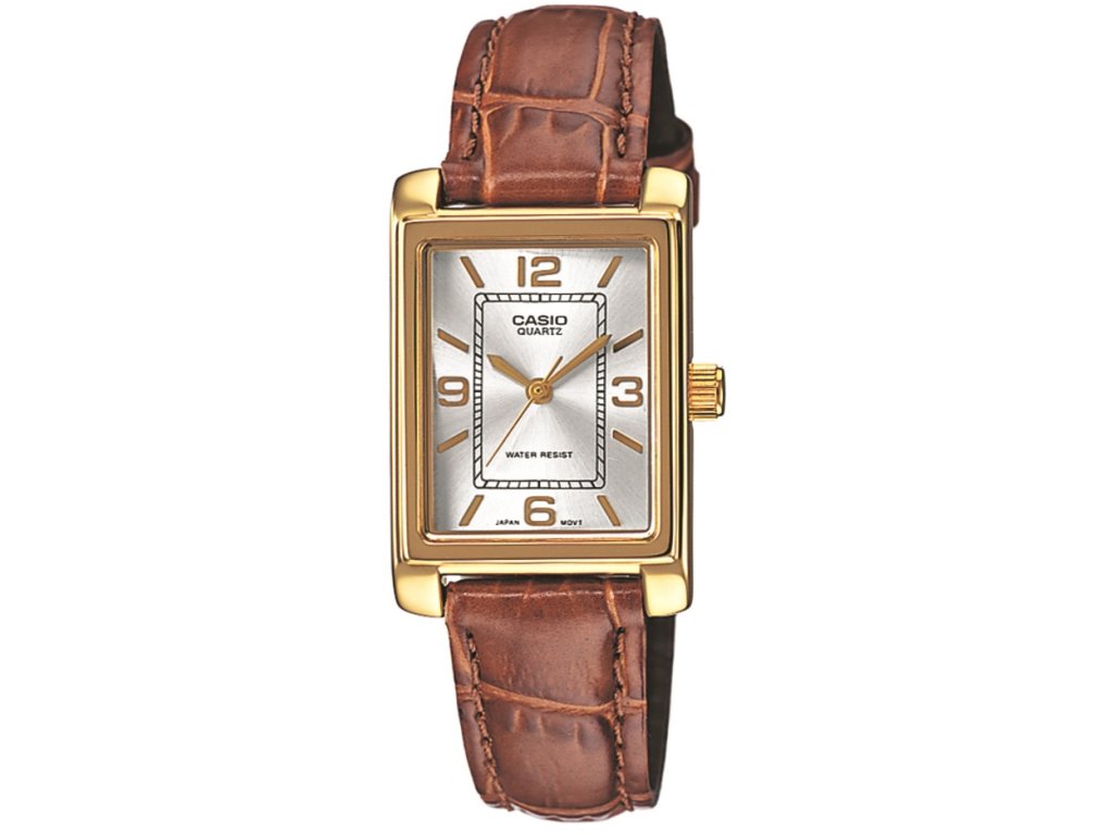 Dámské ručičkové hodinky CASIO LTP 1234GL-7A jsou vyrobené z mosazi ve zlacené úpravě v barvě žlutého zlata v kombinaci s hnědým koženým řemínkem. Sklíčko hodinek je minerální, odolné proti náhodnému poškrábání. Napájení je formou baterie.