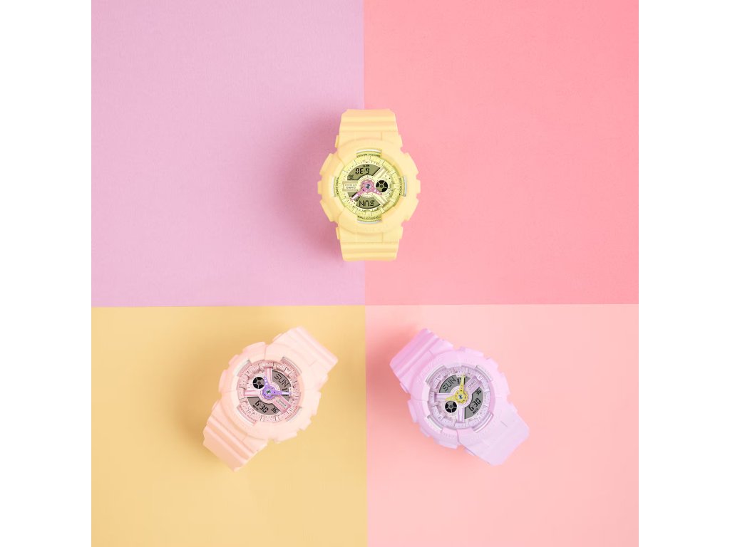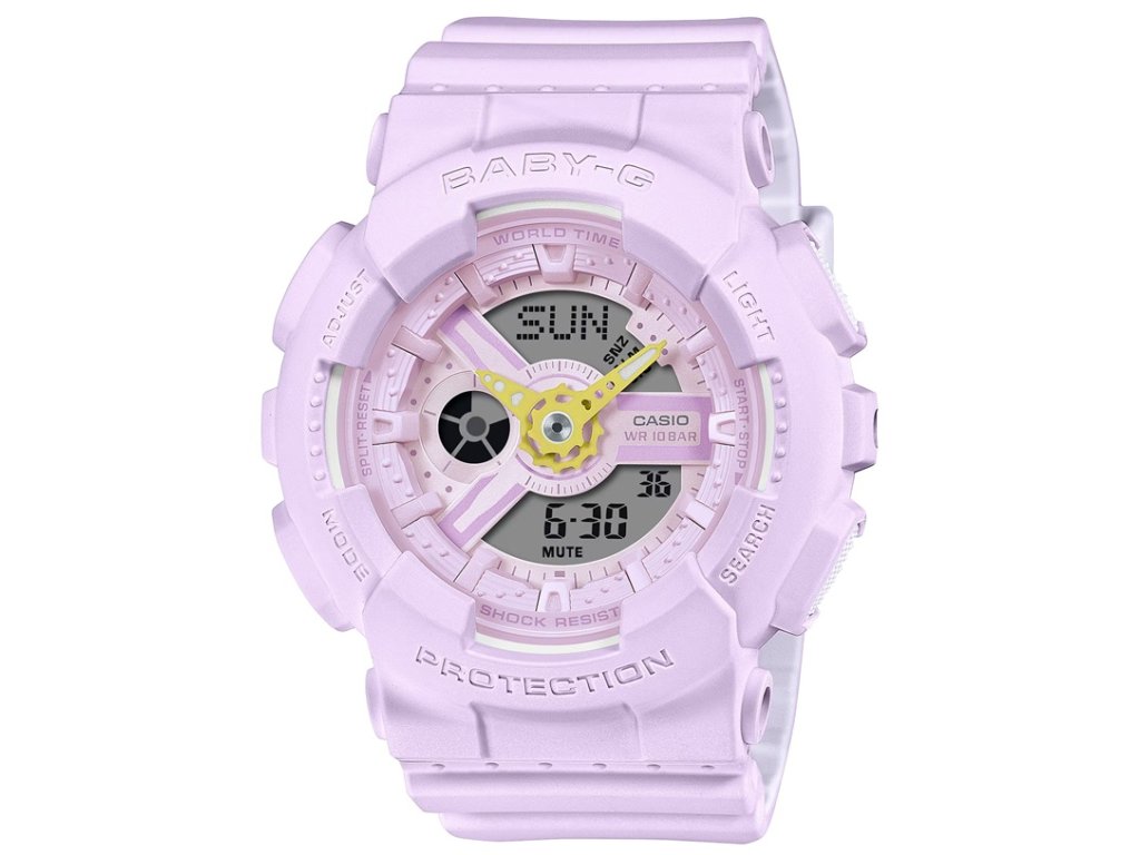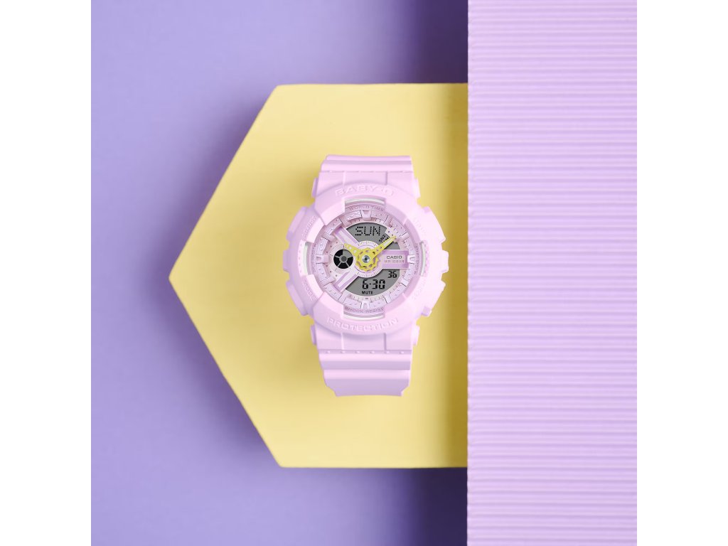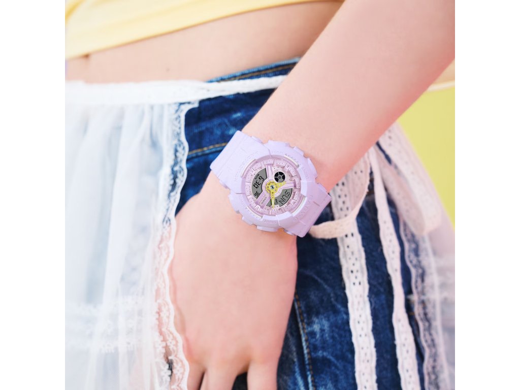 Dámské stylové kombinované hodinky CASIO BA-110AH-6AER jsou vyrobeny z plastu ve fialové barvě. Tento atraktivní model nabízí několik nejen sportovních funkcí - ukazatel dní v týdnu, alarm, kalendář, stopky, odpočítavací stopky a další. Ciferník je možné osvítit LED diodou. Sklo hodinek je minerální, odolné proti náhodnému poškrábání.