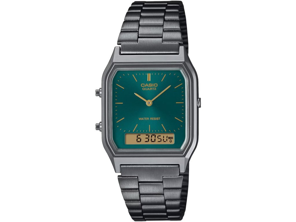RETRO pánské kombinované hodinky CASIO AQ-230EGG-3AEF jsou vyrobeny z plastu v kombinaci s kovovým řemínkem v černé barvě. Hodinky nabízí spoustu funkcí: stopky, odpočet, budík, hodinový signál.