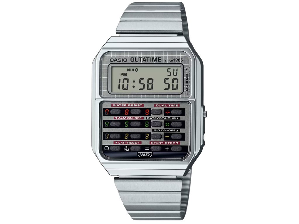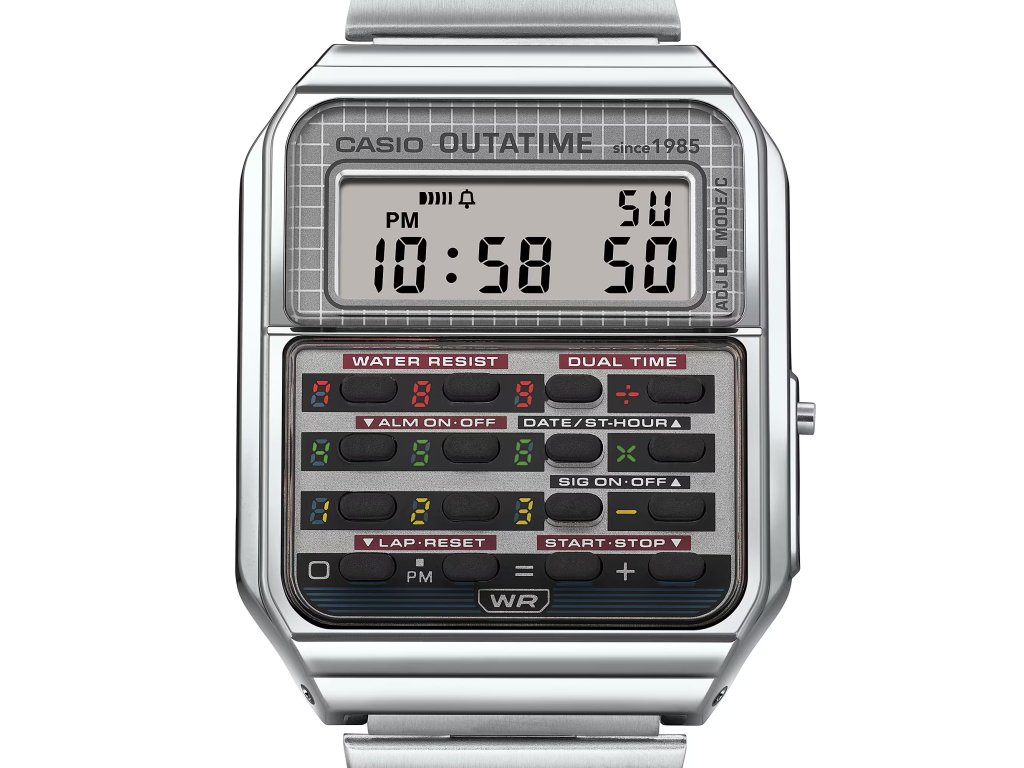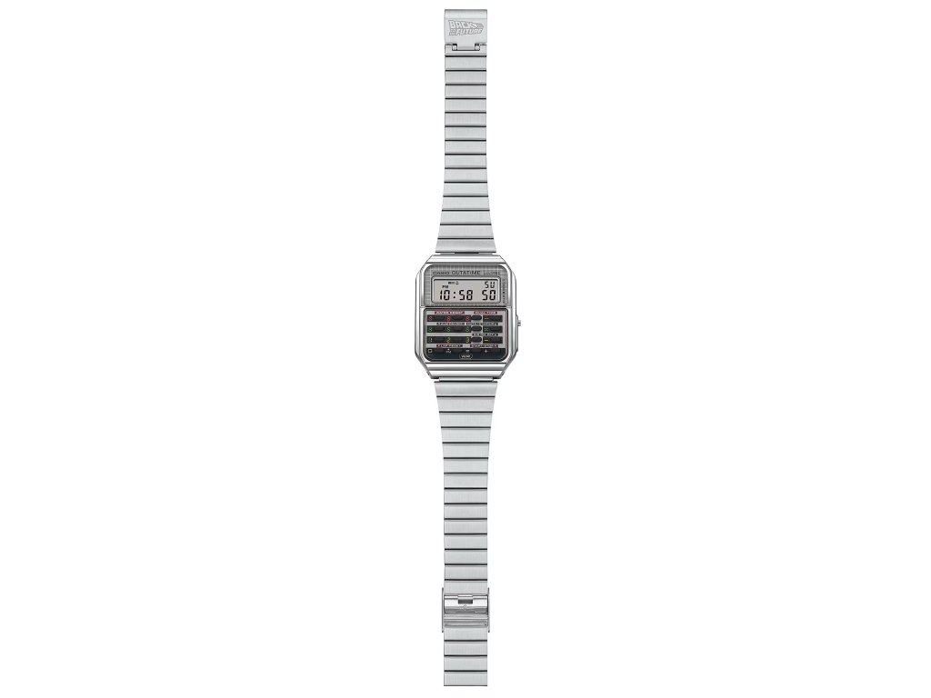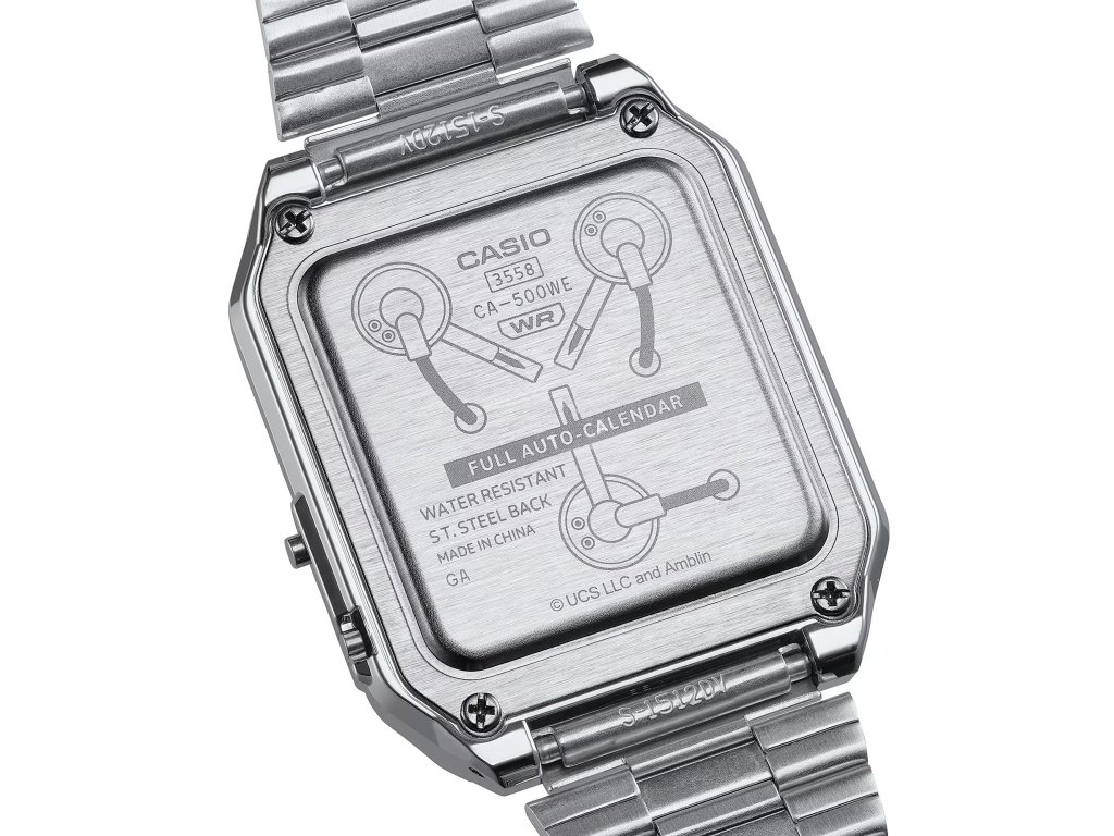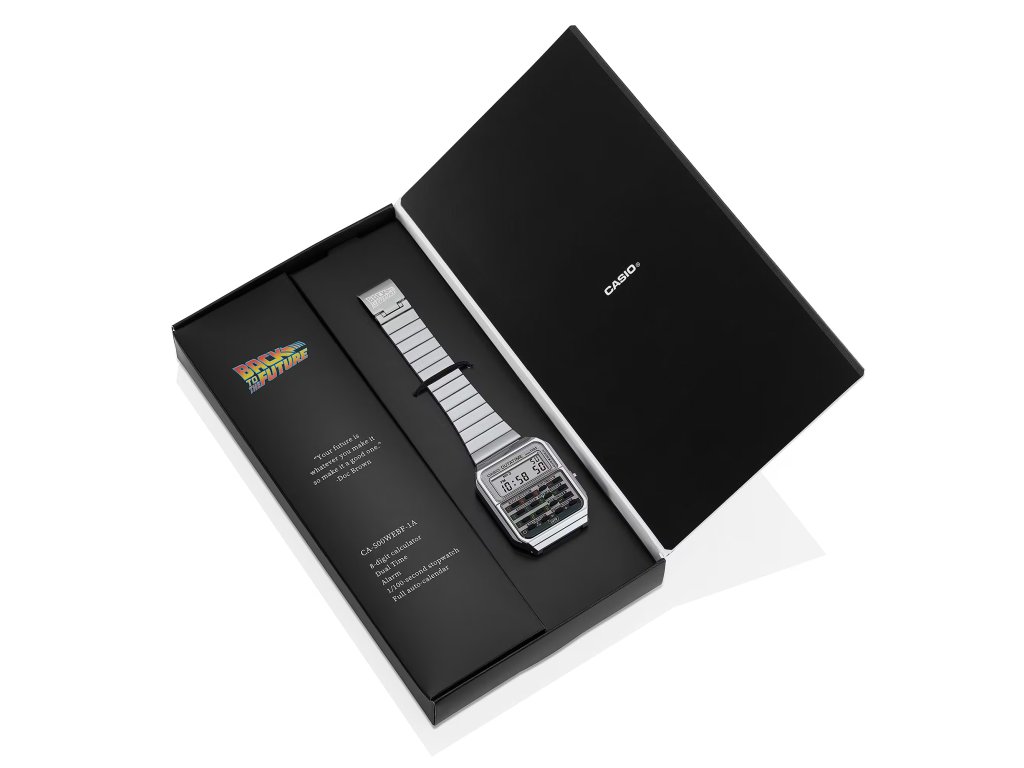 Model CASIO CA-500WEBF-1AER spojuje legendární kalkulačkové hodinky Casio Vintage s nezaměnitelnou atmosférou filmu „Návrat do budoucnosti“. Vznikl tak sběratelský kousek, který je poctou kultovnímu DeLoreanu, Martymu McFlyovi a celé éře dobrodružství napříč časem.