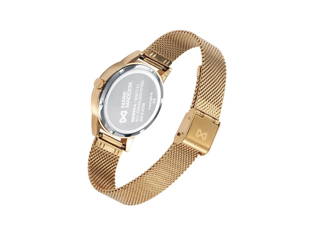 Dámské fashion hodinky MARK MADDOX jsou vyrobeny z kvalitní antialergické slitiny kovu ve zlacené úpravě v barvě žlutého zlata. Na hodinkách na první pohled vynikne stříbrný číselník se zářivými indexy na místě číslic. Sklo hodinek je minerální, odolné proti náhodnému poškrábání.