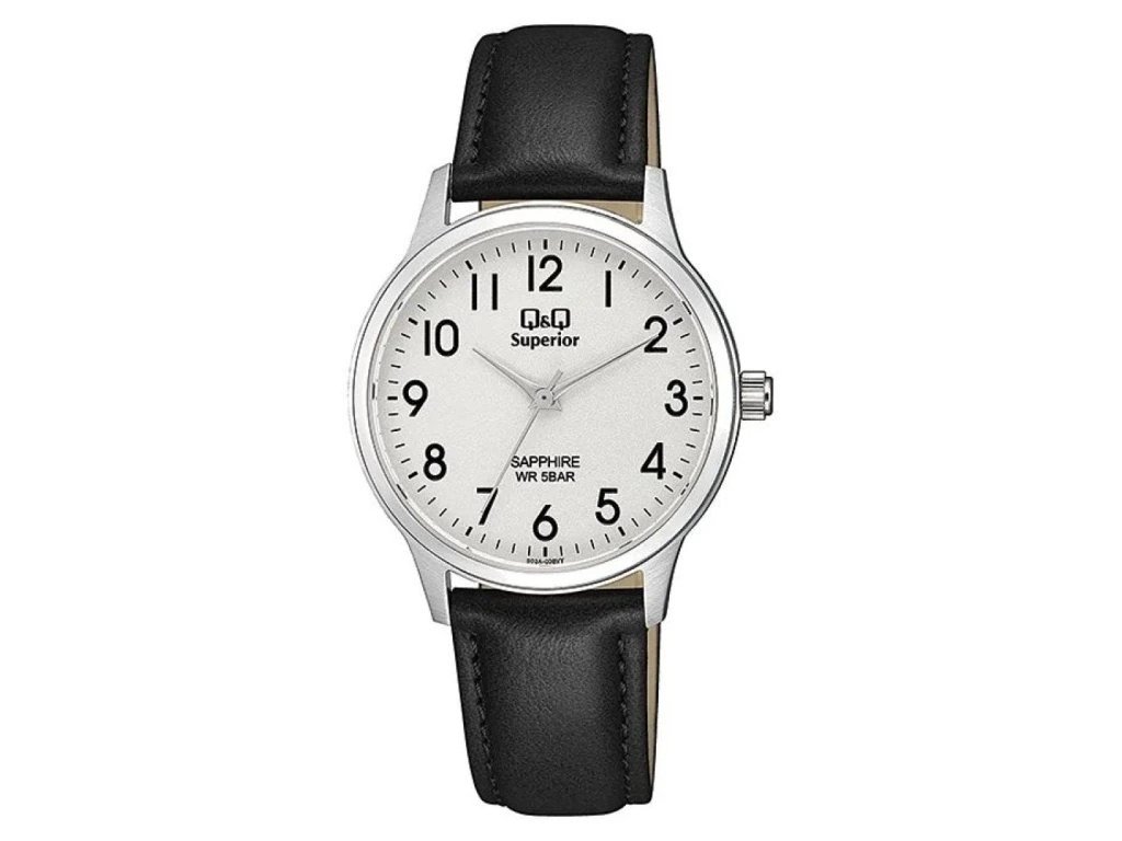 Dámské ručičkové hodinky Q&Q z prémiové řady Superior jsou vyrobeny z kvalitní nerezové oceli ve stříbrné barvě v kombinaci s koženým řemínkem. Na dokonale přehledném ciferníku najdeme černé číslice a stříbrné ručky.
