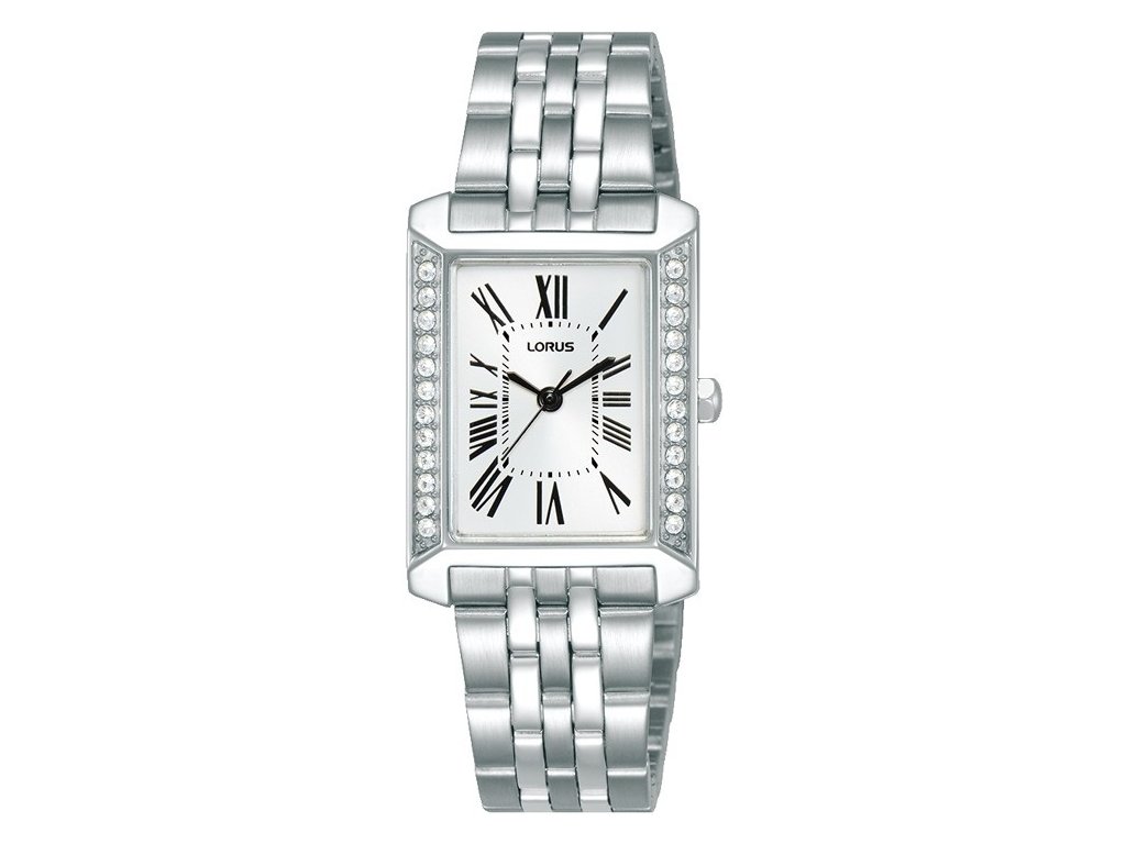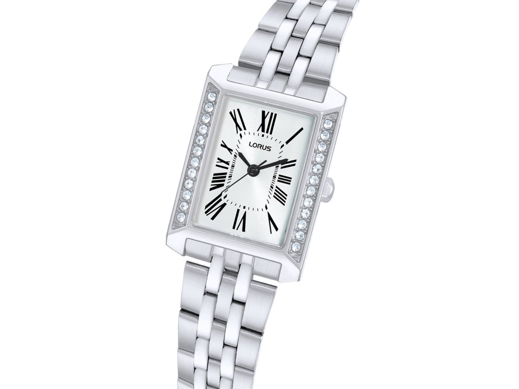 Stříbrný ciferník s výraznými černými římskými číslicemi dodává hodinkám nadčasový charakter. Obdélníkové pouzdro zdobené kamínky po stranách podtrhuje jejich šperkový styl.