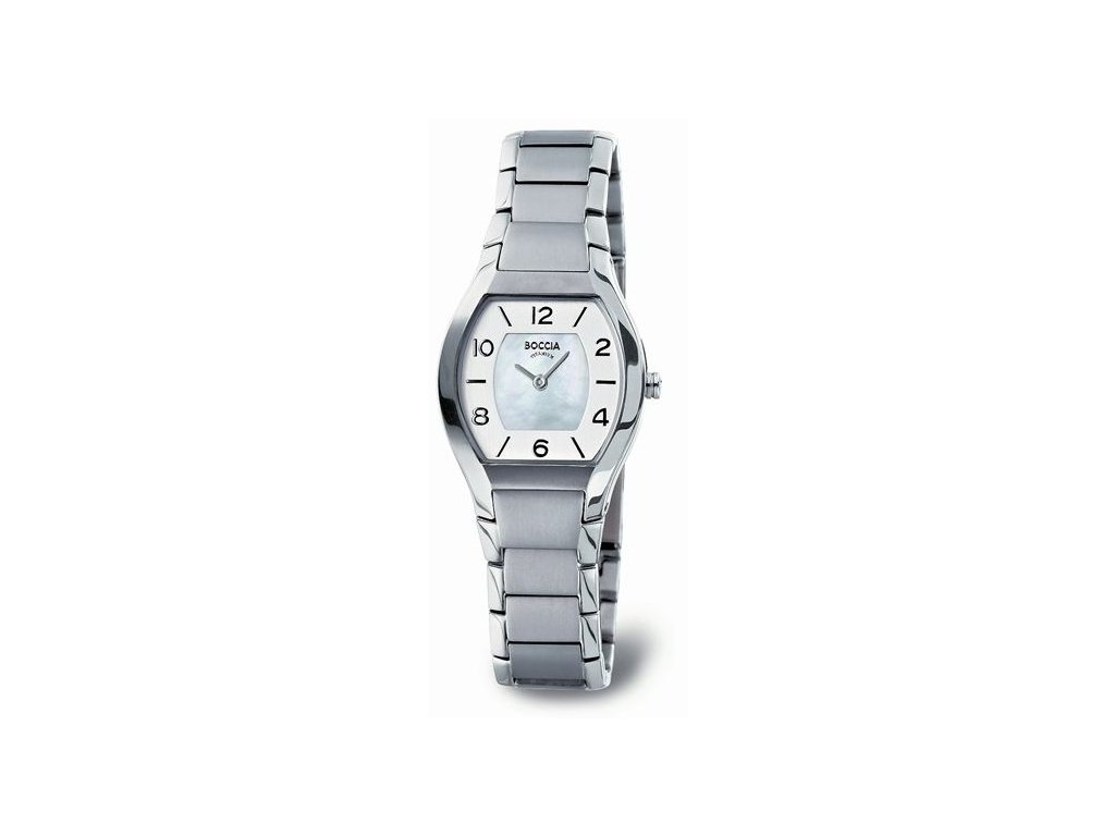 Dámské titanové hodinky BOCCIA TITANIUM 3174-01 jsou vyrobeny z čistého antialergického titanu. Na dobrém pocitu při nošení pomáhá řemínek s překlápěcí sponou s bočním bezpečnostním otevíráním. Díky této vlastnosti je zamezeno náhodné odepnutí a tím ztráta hodinek. Krásně přehledný, perleťový ciferník je chráněn minerálním sklem, které je odolné proti náhodnému poškrábání.