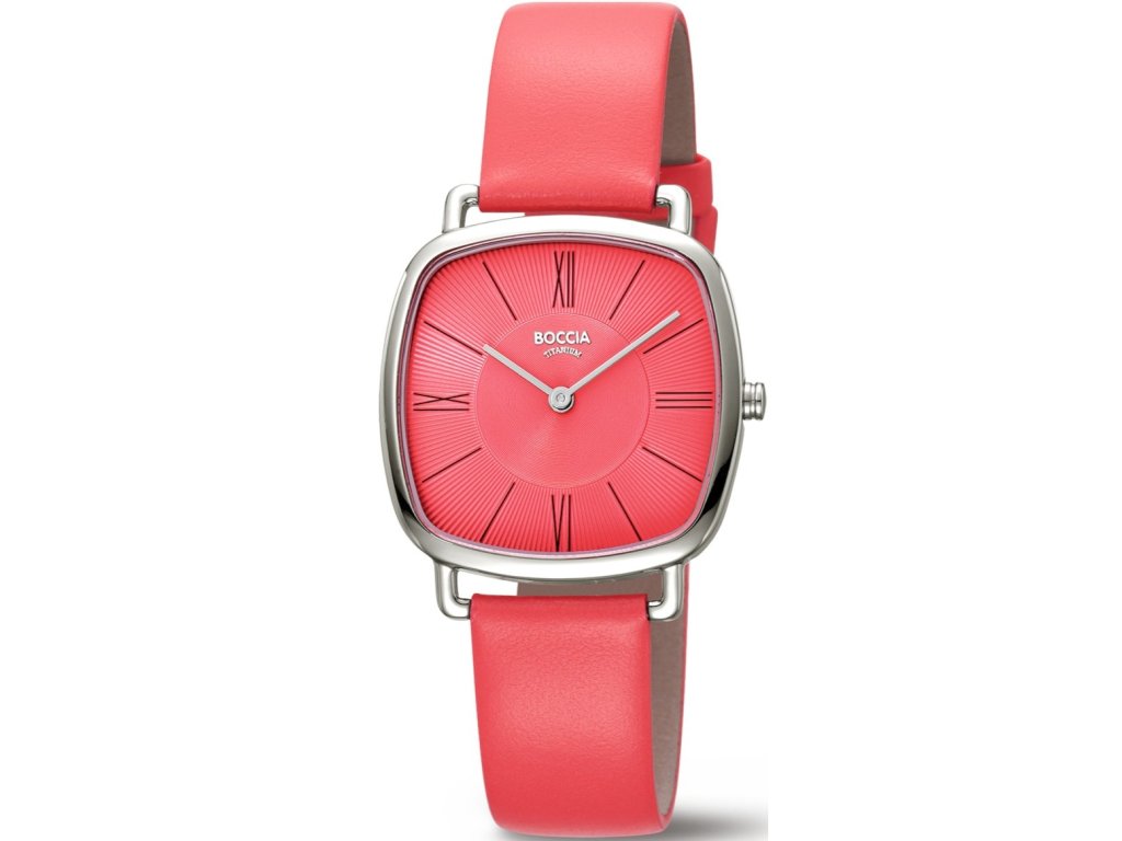 Dámské hodinky Boccia Titanium 3370-03 přinášejí do světa elegance šťavnatou dávku barvy a radosti. Jejich originální čtvercový tvar s jemně zaoblenými hranami působí neobvykle, přesto dokonale vyváženě. Kombinace sytě korálové barvy ciferníku a řemínku působí svěže, hravě a dodá vašemu stylu energii, optimismus i ženský šarm.