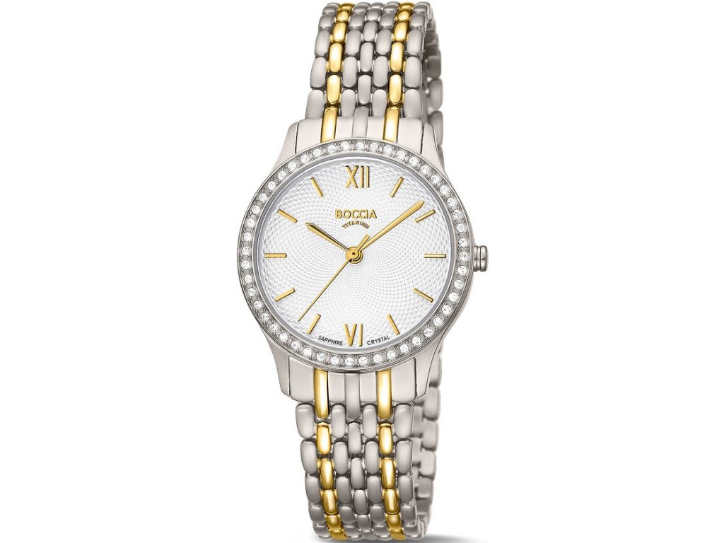 Boccia Titanium 3376-02 jsou elegantní dámské hodinky, které spojují luxusní šperkový vzhled s praktickými vlastnostmi pro každodenní nošení. Stříbrno-zlaté (bicolor) provedení, třpytivá luneta a jemně strukturovaný ciferník z nich dělají výrazný, ale stále velmi vkusný doplněk. Typická lehkost a komfort značky Boccia Titanium zde hrají klíčovou roli.