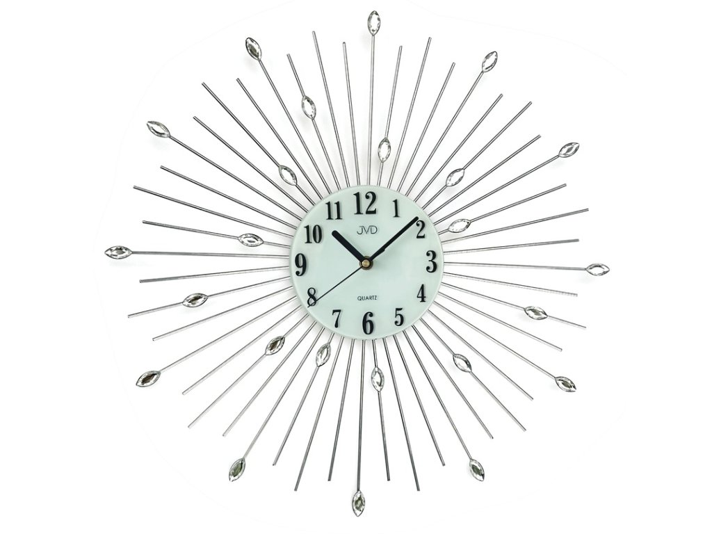 Designové hodiny JVD HJ117 spojují eleganci, moderní styl a dekorativní prvky, které z nich dělají opravdový šperk na stěně. Kovové tyčky vycházející ze středu ciferníku jsou zdobené jemnými třpytivými kamínky, jež vytvářejí krásný světelný efekt a dodávají hodinám luxusní vzhled.
