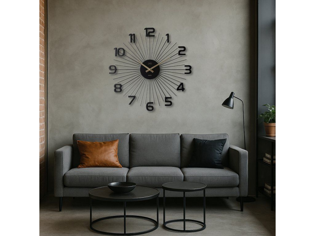 Jejich jedinečný design tvoří černé kovové tyčky, které vycházejí ze středu a vytvářejí dojem slunečních paprsků. Na jejich koncích se vyjímají výrazné černé plastové číslice, díky nimž jsou hodiny nejen stylové, ale také dokonale čitelné.