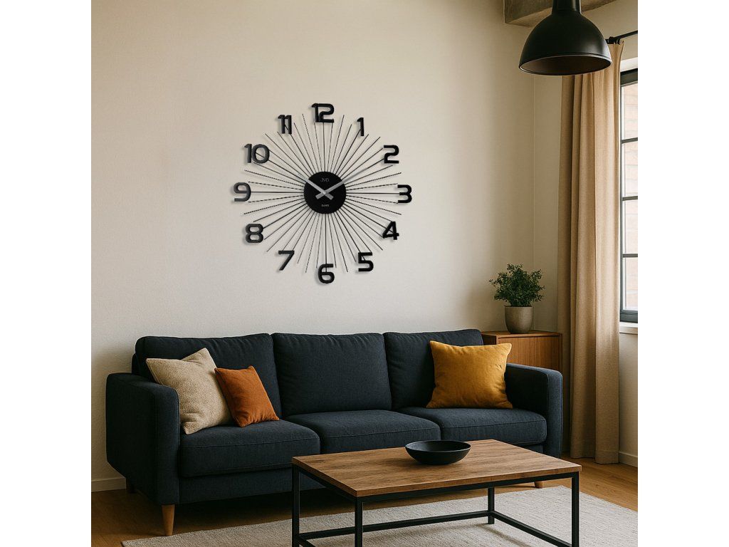 Jejich jedinečný design tvoří černé kovové tyčky, které vycházejí ze středu a vytvářejí dojem slunečních paprsků. Na jejich koncích se vyjímají výrazné černé plastové číslice, díky nimž jsou hodiny nejen stylové, ale také dokonale čitelné.