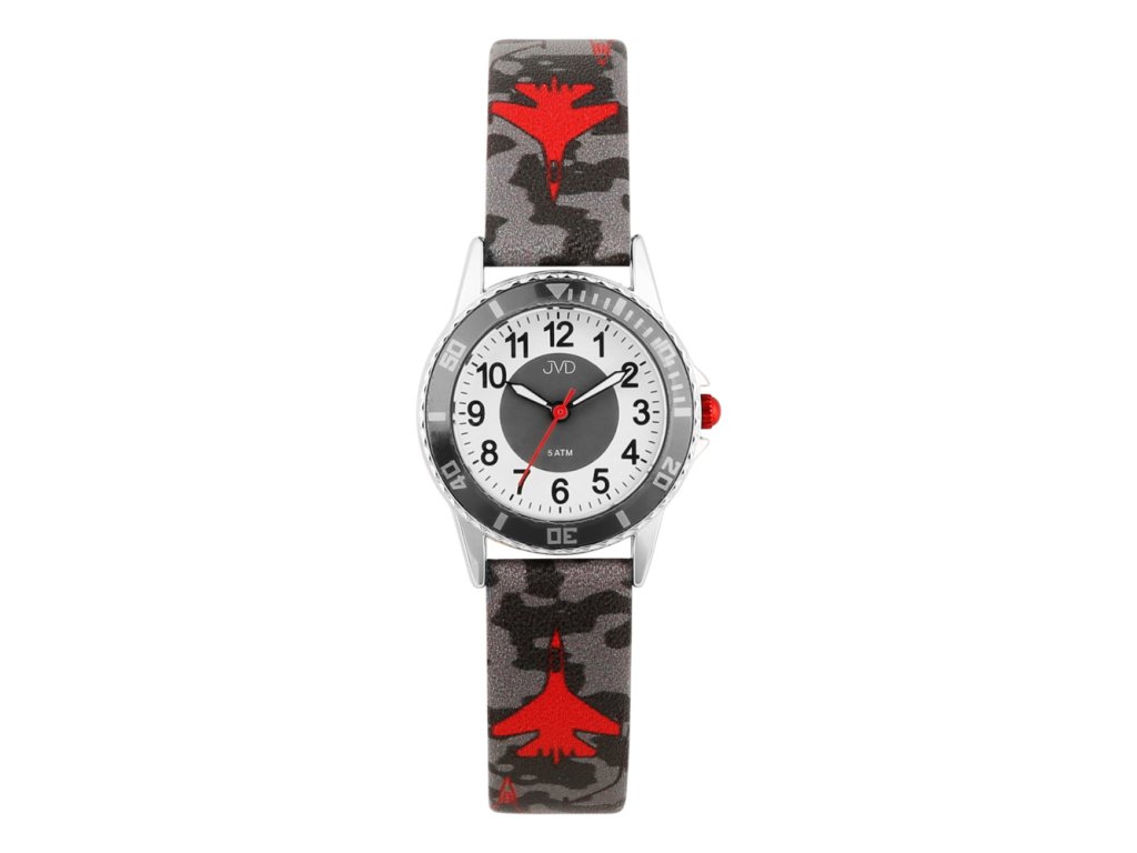 Hodinky JVD J7235 jsou ideální volbou pro všechny kluky, kteří milují letadla, armádní styl a dobrodružství. Na první pohled zaujmou svým sportovním designem s maskáčovým řemínkem a motivem stíhaček, který dodává hodinkám jedinečný a odvážný vzhled. Výrazná luneta podtrhuje jejich chlapácký charakter a připomíná skutečné sportovní hodinky pro dospělé.