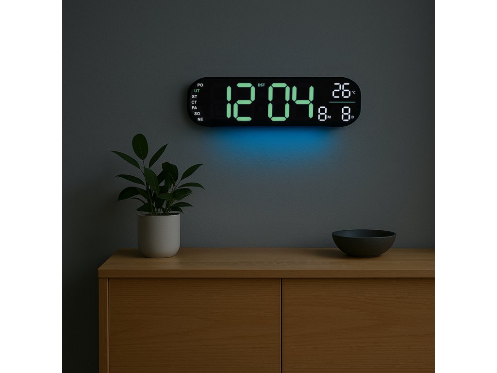 Dominantou je velký a jasně svítící LED displej, díky němuž je čas perfektně čitelný i z větší vzdálenosti nebo v úplné tmě. Moderní podsvícení zajišťuje, že hodiny působí elegantně a zároveň jsou maximálně funkční.