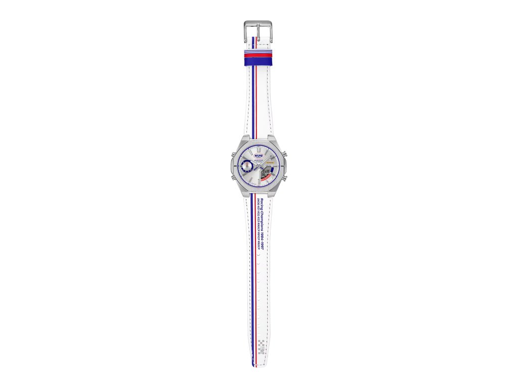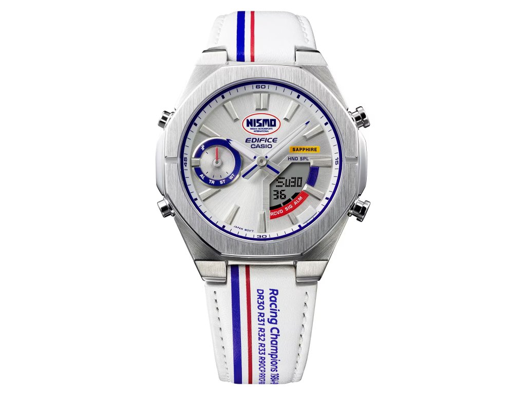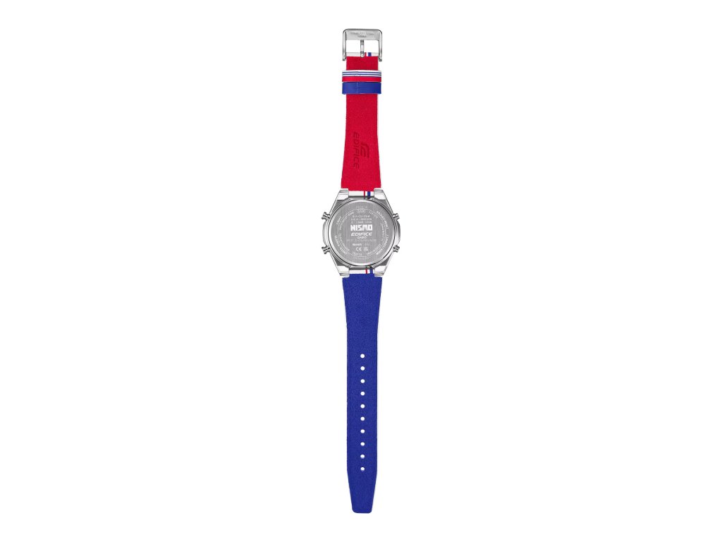 Na první pohled zaujme ciferník i řemínek v barvách ikonické trikolóry NISMO. Modrá a červená se objevují i na spodní straně řemínku, zatímco poutko nese pruhy inspirované původní závodní kombinézou. Unikátním detailem jsou vytištěná jména jezdců a šampionů NISMO z let 1984–1997 – připomínka zlaté éry týmu.