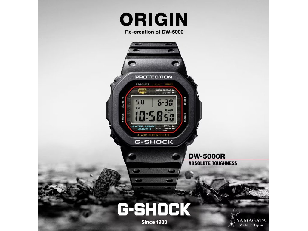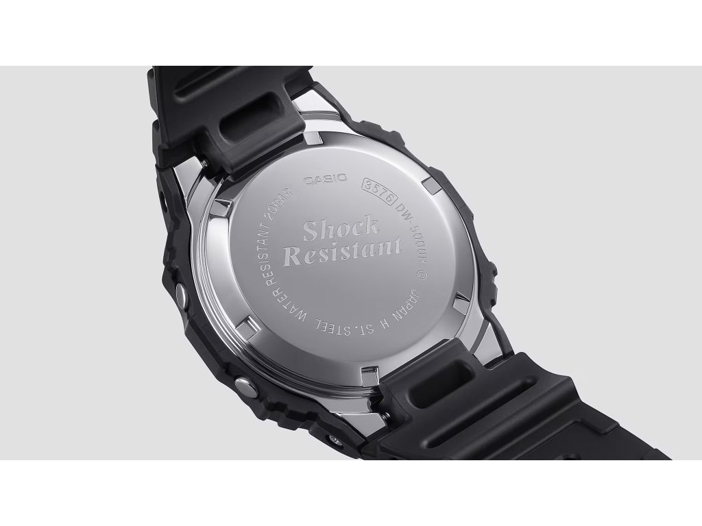 DW-5000R se svým designem vrací k prvnímu modelu G-Shock, který změnil svět hodinek svou nezničitelností a odolností. Tento modernizovaný model zachovává původní DNA – od robustního pouzdra z nerezové oceli až po ikonický vzhled řemínku, který je detailně reprodukován včetně originální délky, tvaru a pozice výstupků. Pouzdro bylo mírně zvětšeno na 42.3 mm, čímž hodinky získávají modernější a výraznější vzhled, přičemž stále zůstávají věrné svému původu s původními proporcemi.