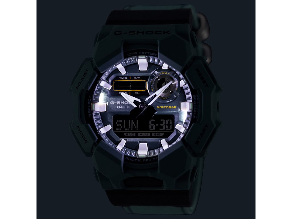 GA-010 je analogově-digitální model, který kombinuje klasický vzhled ručičkových hodinek s moderními digitálními funkcemi. Nabízí praktické funkce, jako je světový čas, stopky a odpočítávání času, což oceníte při cestování, sportu nebo každodenním používání. Vysoce jasné LED osvětlení zajišťuje, že můžete snadno odečítat čas i za špatných světelných podmínek, a to pouhým stisknutím velkého tlačítka umístěného na přední straně pouzdra.