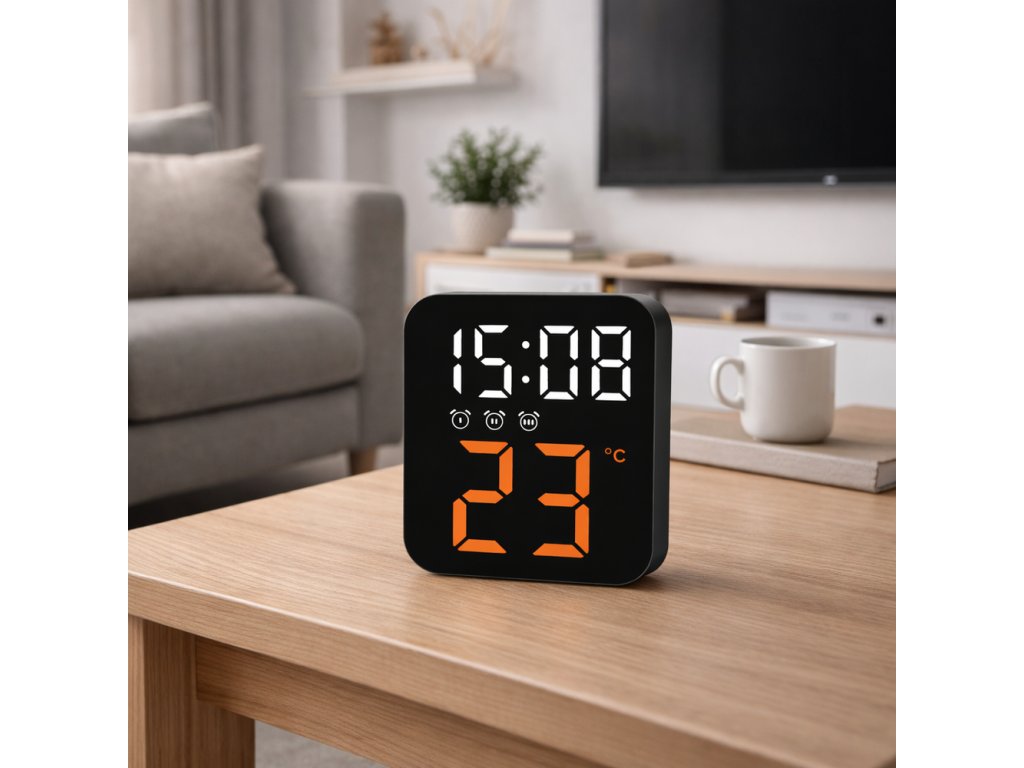 Displej: bílé číslice času, oranžové číslice teploty