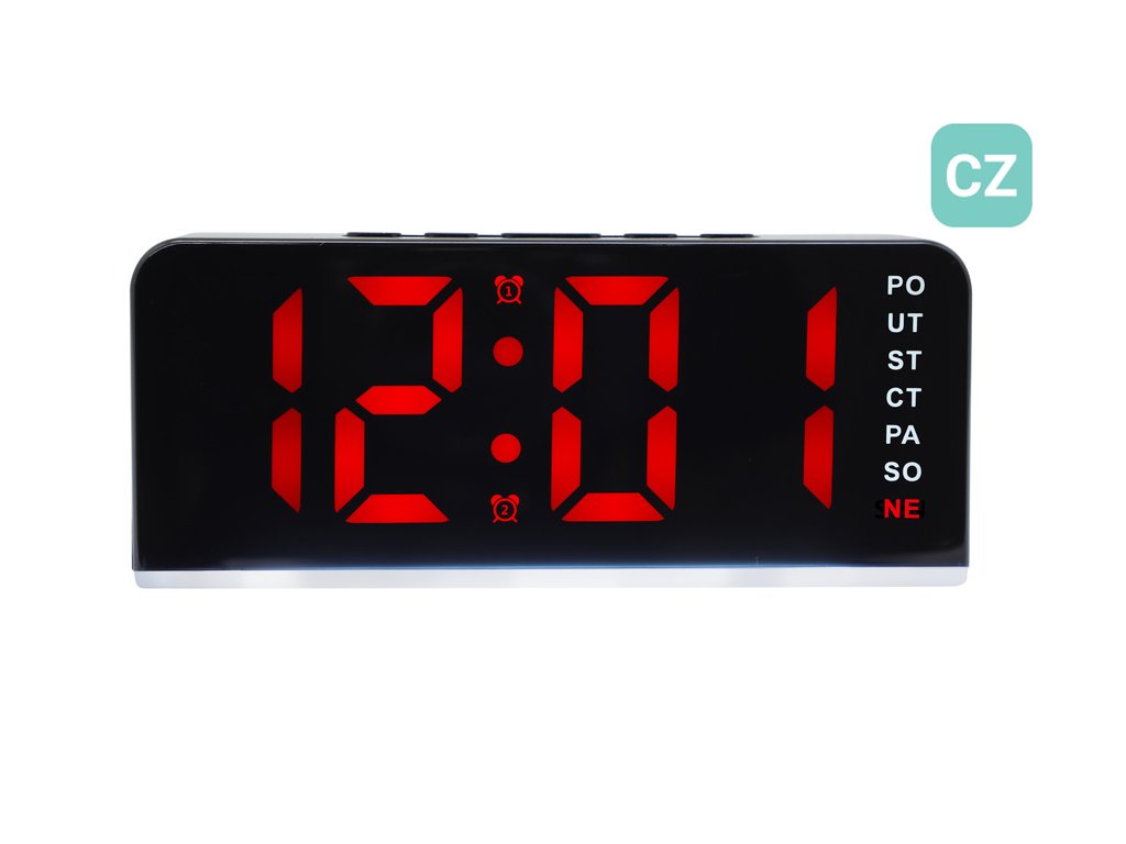 Budík disponuje svítícím LED displejem, na kterém pohodlně zjistíte čas, den v týdnu v češtině a teplotu. Díky výrazným číslicím je čas snadno čitelný i z větší vzdálenosti nebo při slabším osvětlení.