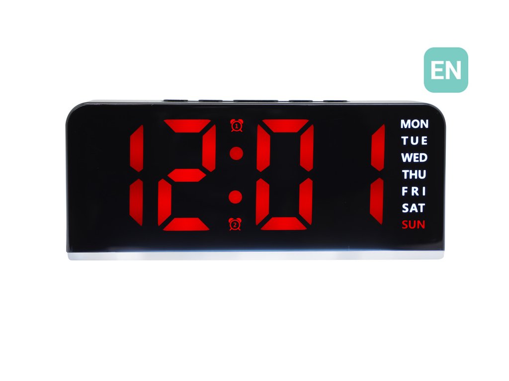 Budík disponuje svítícím LED displejem, na kterém pohodlně zjistíte čas, den v týdnu v češtině a teplotu. Díky výrazným číslicím je čas snadno čitelný i z větší vzdálenosti nebo při slabším osvětlení.