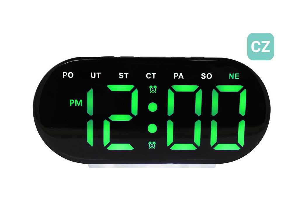 Budík disponuje svítícím LED displejem, na kterém pohodlně zjistíte čas, den v týdnu v češtině a teplotu. Díky výrazným číslicím je čas snadno čitelný i z větší vzdálenosti nebo při slabším osvětlení.
