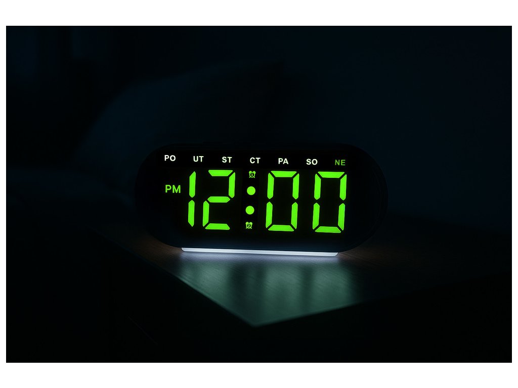 Displej nabízí tři úrovně jasu, takže si můžete zvolit intenzitu podle svých preferencí. Pokud si přejete klid v noci, lze svícení zcela vypnout – hodiny pak ukazují čas pouze po stisku tlačítka.