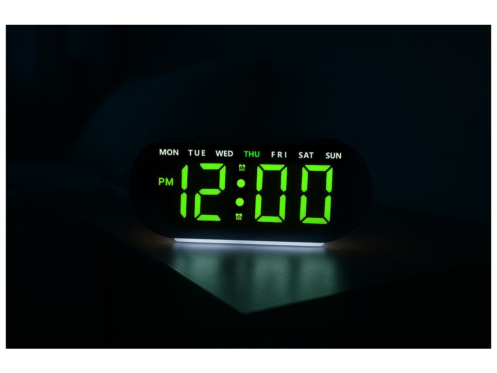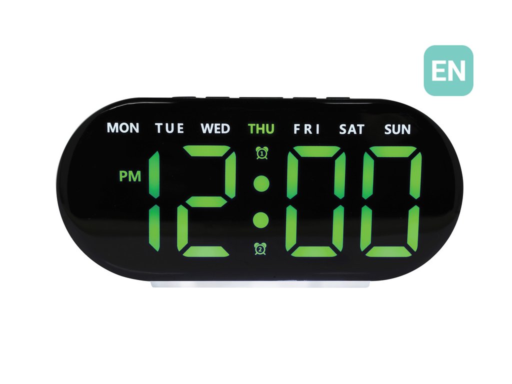 Budík disponuje svítícím LED displejem, na kterém pohodlně zjistíte čas, den v týdnu v angličtině a teplotu. Díky výrazným číslicím je čas snadno čitelný i z větší vzdálenosti nebo při slabším osvětlení.