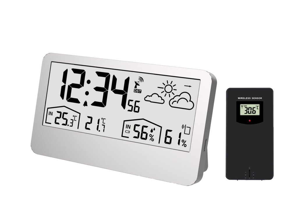 Rádiem řízená meteorologická stanice JVD s bezdrátovým čidlem. Stanice na velkém přehledném displeji zobrazuje čas, datum, předpověď počasí, včetně měsíční fáze a samozřejmě vnitřní a venkovní vlhkost a teplotu. Přístroj je dále vybaven dvěma budíky s funkcí opakování a celoplošným podsvícením displeje.