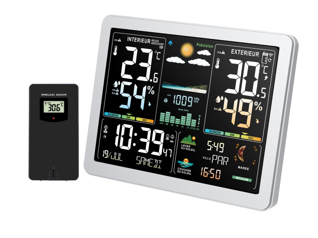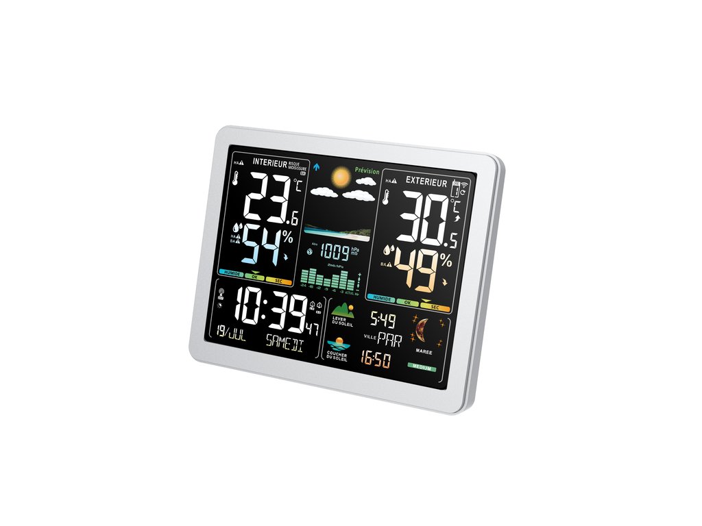 Seznamte se s meteorologickou stanicí nové generace s úžasným barevným displejem, díky kterému budete mít všechny potřebné informace pěkně přehledně a pohromadě. Stanice nabízí rádiem řízený čas, vnitřní i venkovní teplotu, ukazatel vlhkosti a dokonce i fáze měsíce. Nesmí chybět budík s postupným zesilováním buzení.