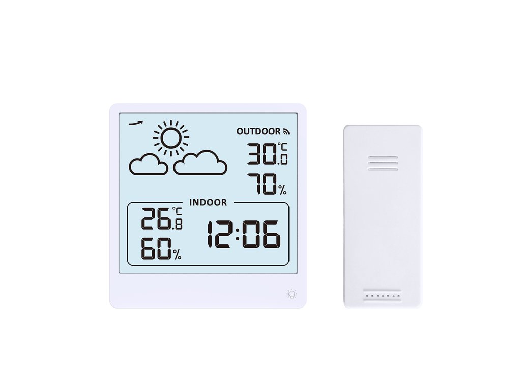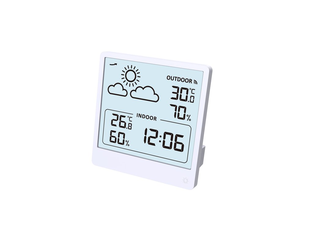 Teploměr JVD s venkovním čidlem s měřením vnitřní a venkovní teploty. Na velkém přehledném displeji se kromě venkovní a vnitřní teploty zobrazuje také čas a vlhkost. Hezkou vychytávkou je předpověď počasí v jednoduchém symbolickém provedení. O napájení se starají 2 mikrotužkové AAA baterie. Pokud jsou baterie již slabé, na displeji se zobrazí upozornění.