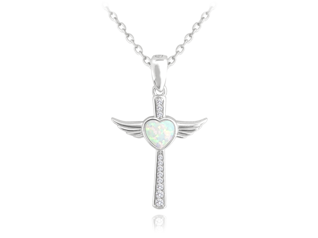 MINET Stříbrný náhrdelník ANDĚLSKÝ KŘÍŽEK s bílým opálovým srdíčkem