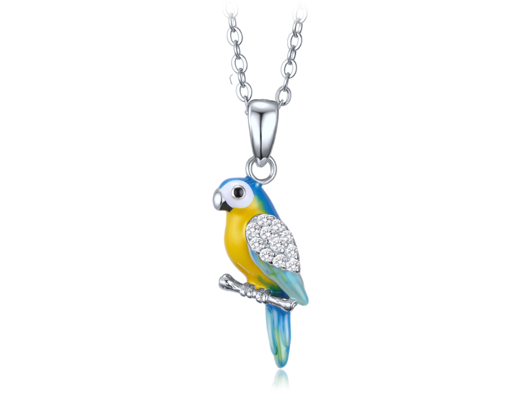 Stříbrný náhrdelník MINET s motivem papouška je vyroben ze stříbra Ag 925/1000 s rhodiovaným povrchem, který pomáhá zachovat jeho lesk i barvu. Barevné prvky v odstínech žluté, tmavě modré, černé a bílé vytvářejí výrazný design, zatímco bílý zirkon dodává jemný třpyt. MINET je česká značka zaměřená na kvalitní hodinky a šperky ze stříbra a zlata.Doplňkové parametry
