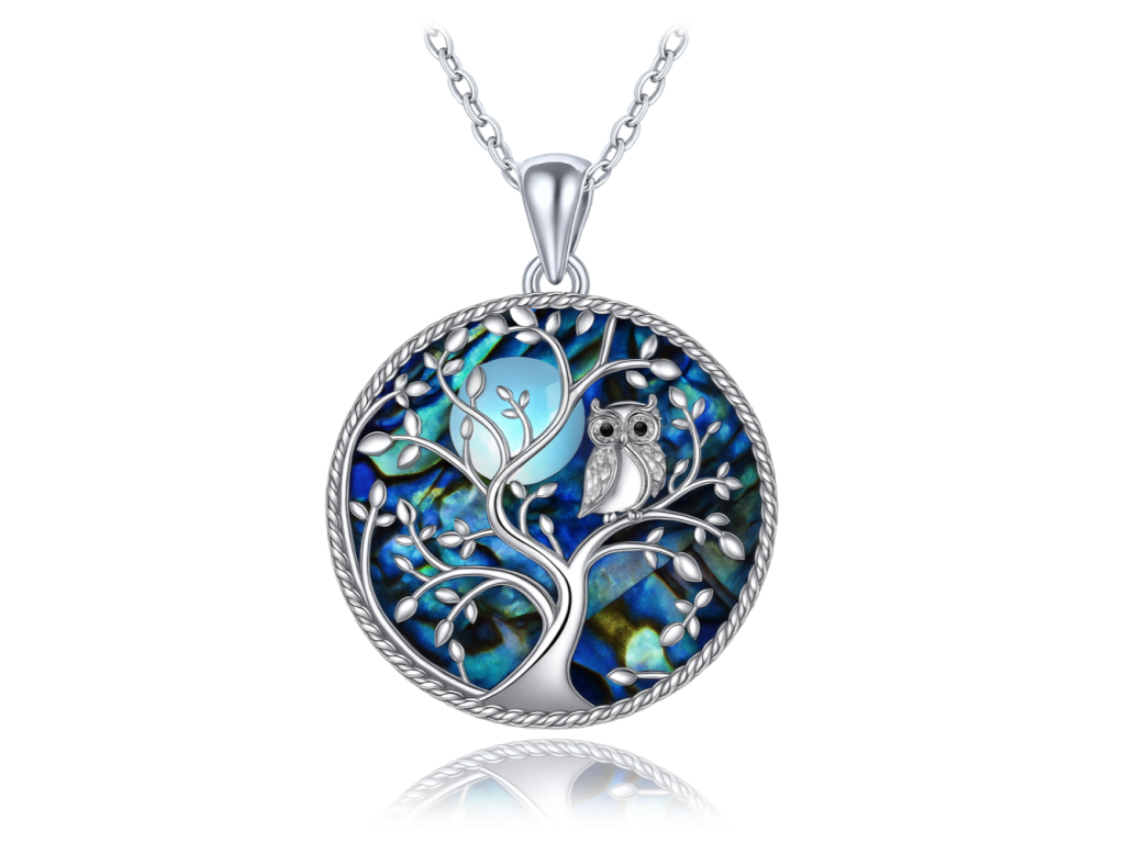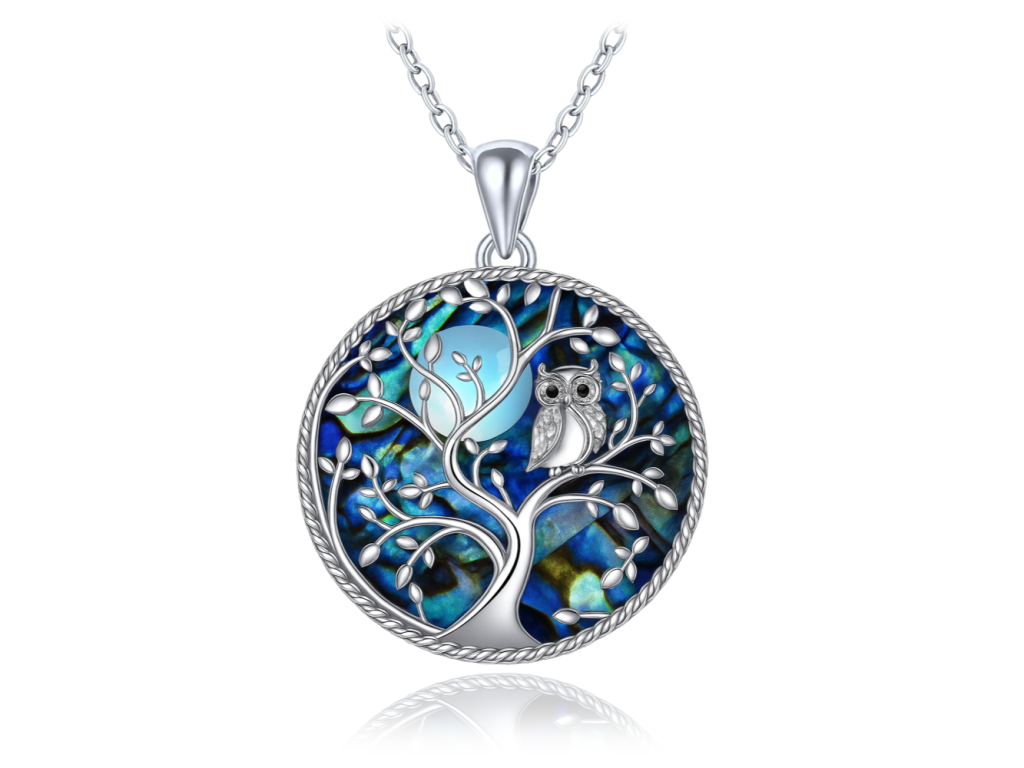 MINET Stříbrný náhrdelník strom života se sovou s černými zirkony a perletí