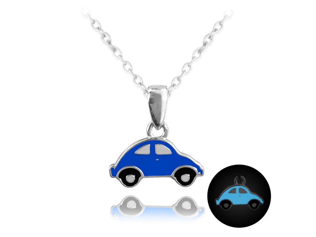 MINET Svítící modrý dětský stříbrný náhrdelník AUTO