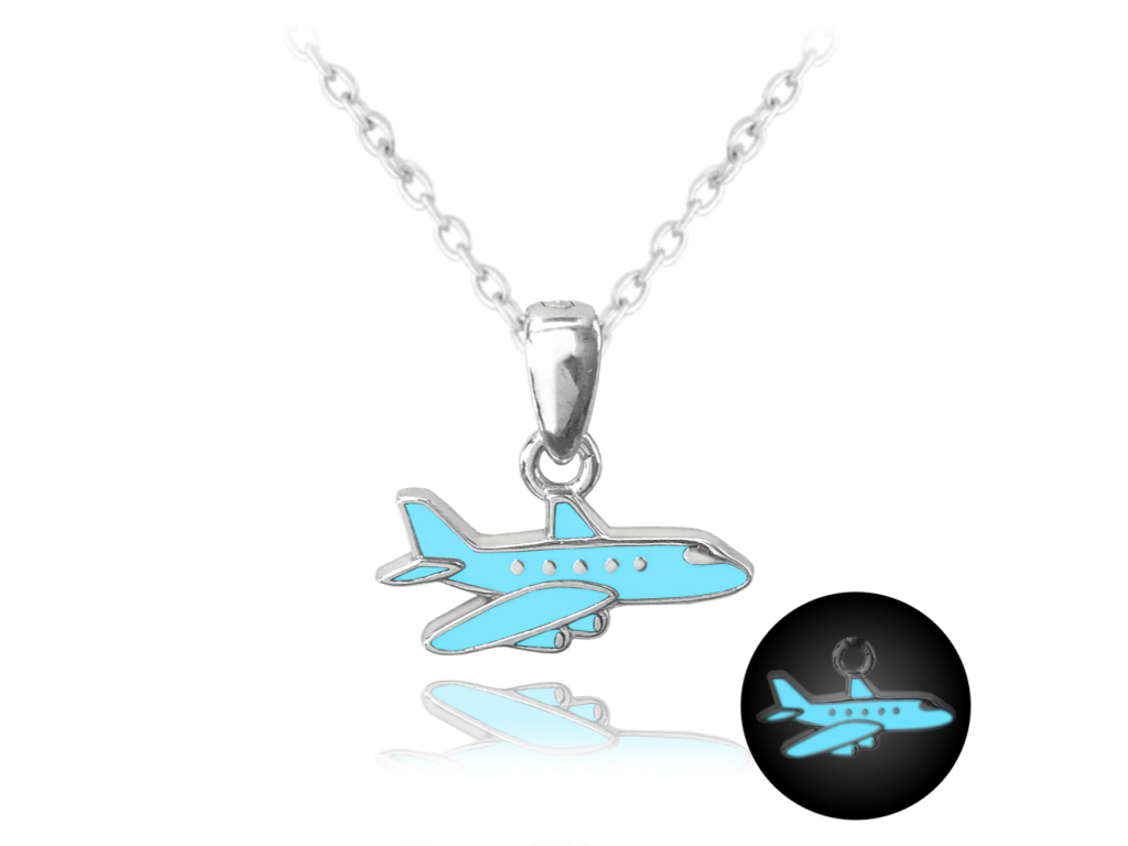 MINET Svítící modrý dětský stříbrný náhrdelník LETADLO