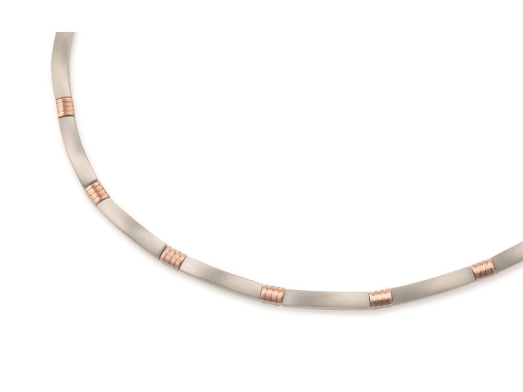 Dámský náhrdelník Boccia Titanium vyrobený z titanu. Spojky mezi delšímu články náhrdelníku jsou částečně pozlaceny růžovým zlacením.