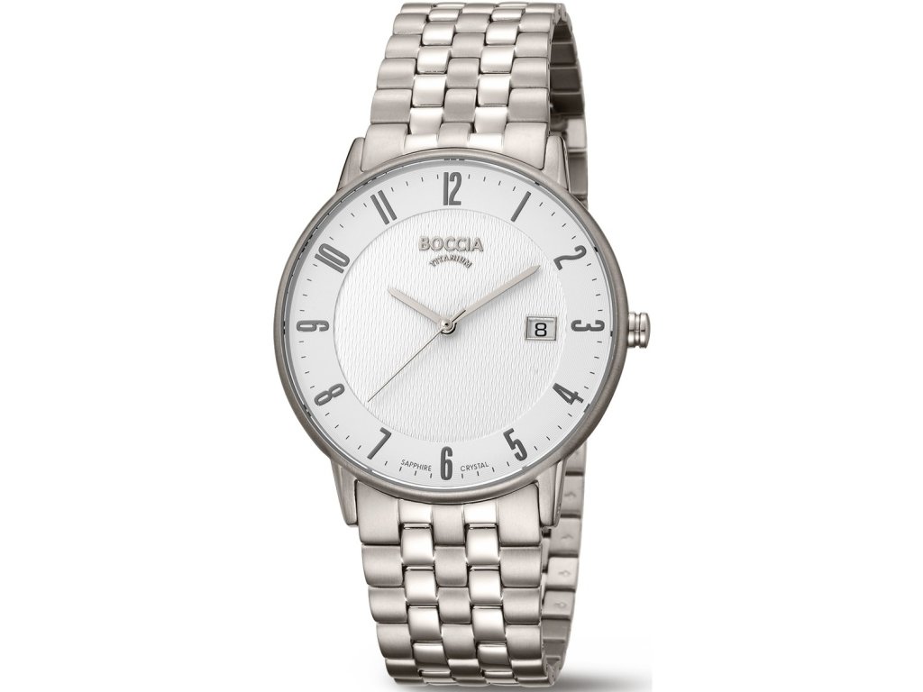 Pánské elegantní hodinky BOCCIA TITANIUM 3607-06 jsou vyrobeny z čistého antialergického titanu. Přehledný a perfektně čitelný, modrý ciferník doplněný o datumovku je chráněn safírovým sklem, které je mimořádně odolné proti náhodnému poškrábání.