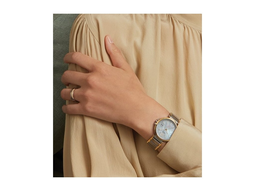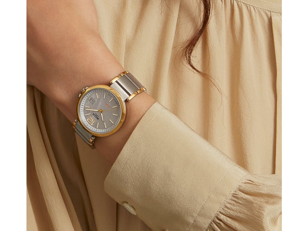 Dámské ručičkové hodinky Boccia Titanium 3332-02 jsou vyrobeny z čistého antialergického titanu s částečně zlacenou PVD úpravou v barvě žlutého zlata. Na přehledném perleťovém světlém číselníku najdeme datumovku na pozici tři a výrazné indexy.