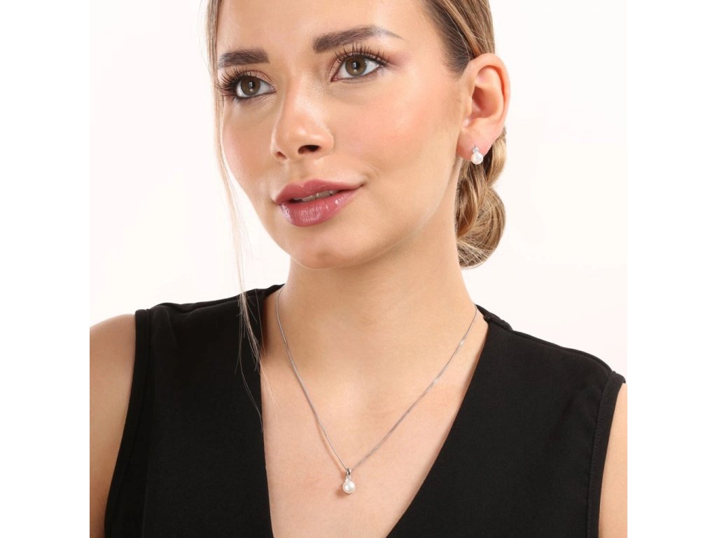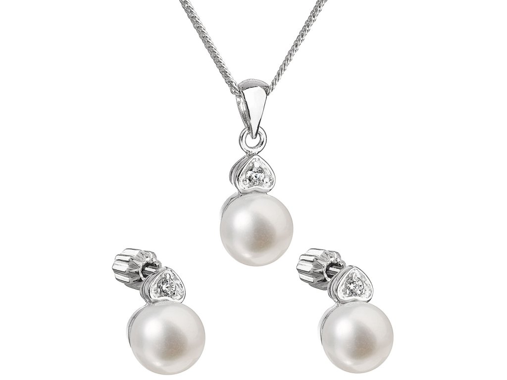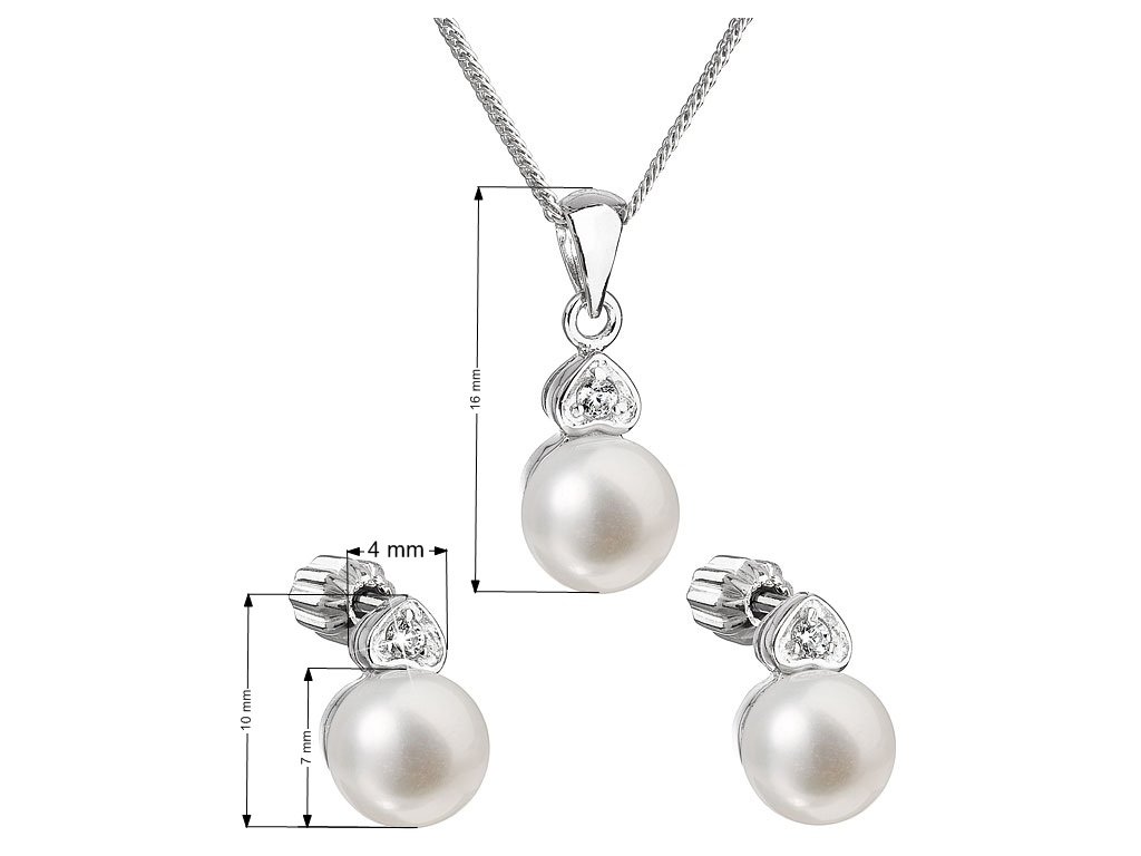 Nádherná stříbrná souprava šperků s bílými říčními perlami a zirkony. Sada obsahuje náušnice na šroubek, přívěs a řetízek.