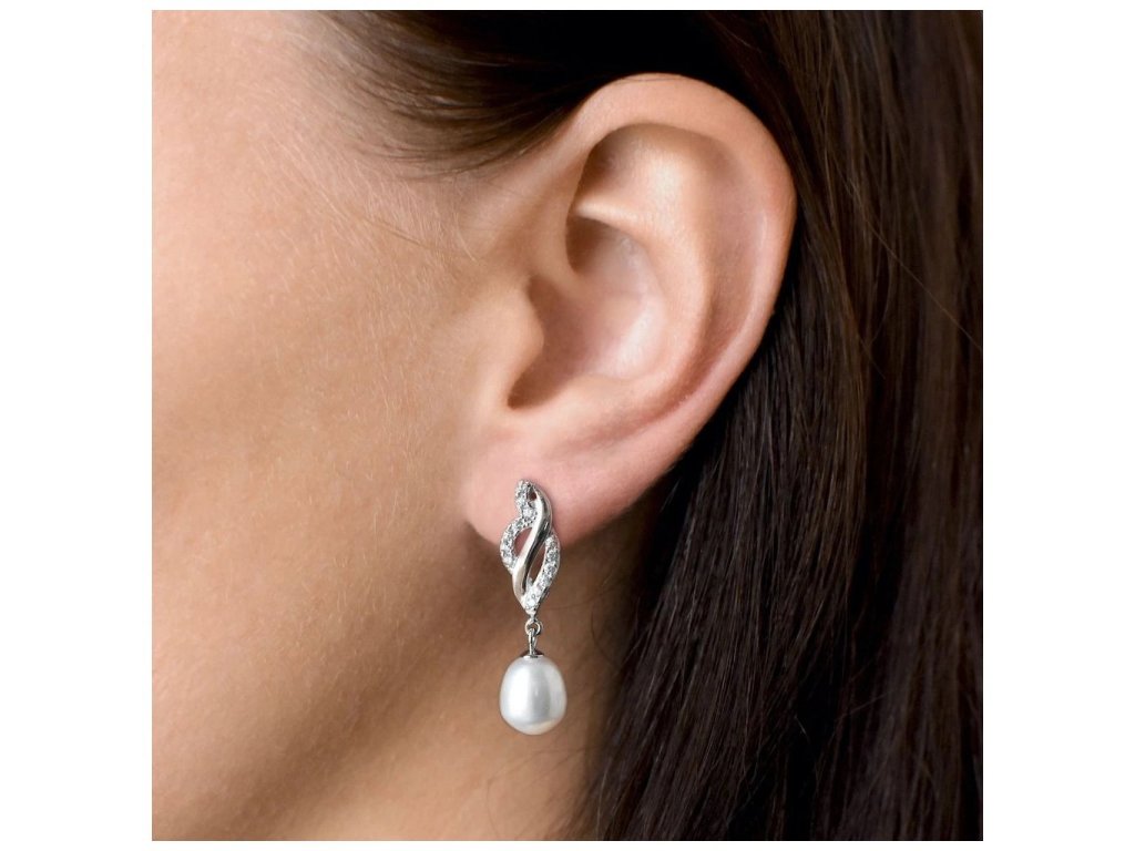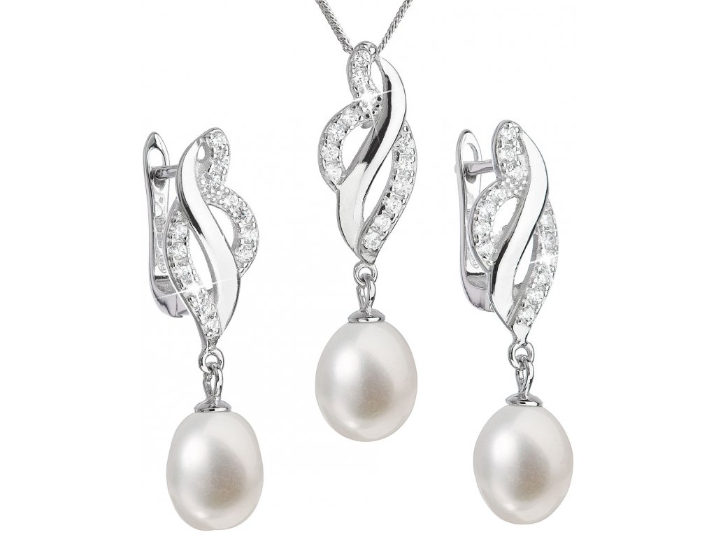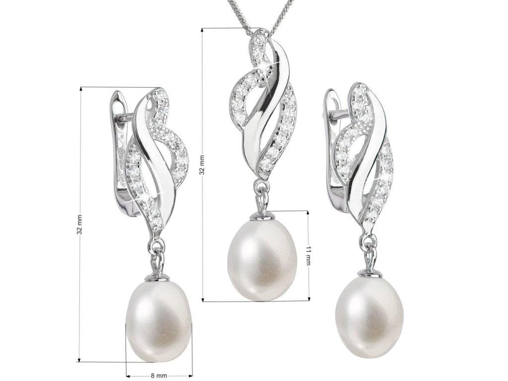 Nádherná stříbrná souprava šperků s bílými říčními perlami a zirkony. Sada obsahuje náušnice se zapínáním na patent, přívěs a řetízek.