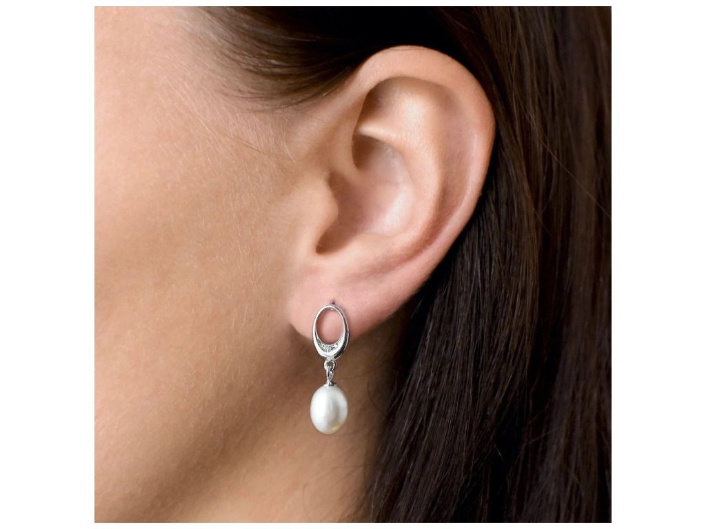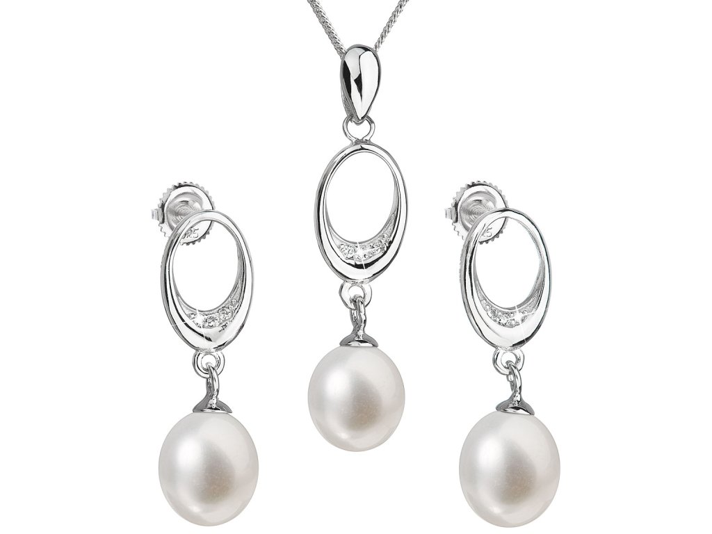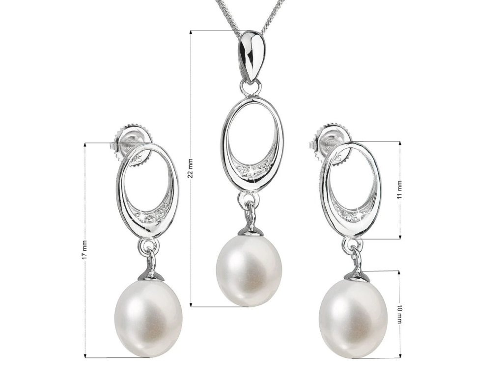 Nádherná stříbrná souprava šperků s bílými říčními perlami a zirkony. Sada obsahuje náušnice na puzetu, přívěs a řetízek.