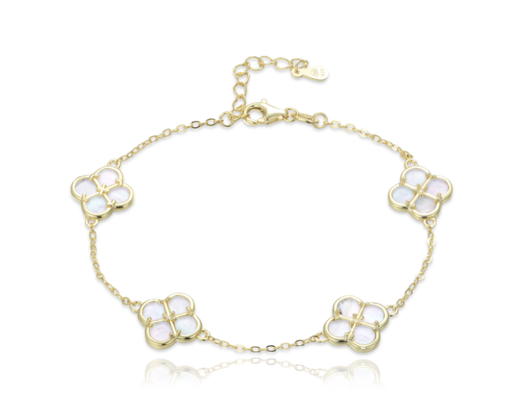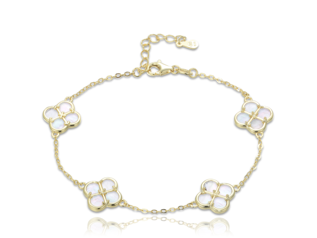 MINET Pozlacený stříbrný náramek čtyřlístky s bílou perletí