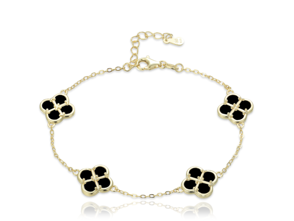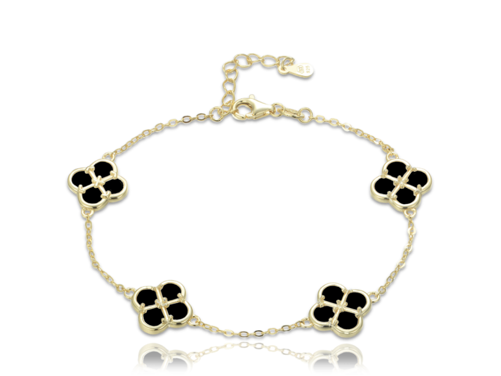MINET Pozlacený stříbrný náramek čtyřlístky s černou perletí