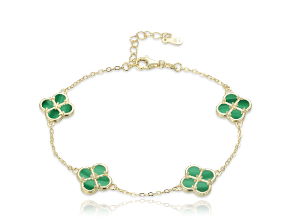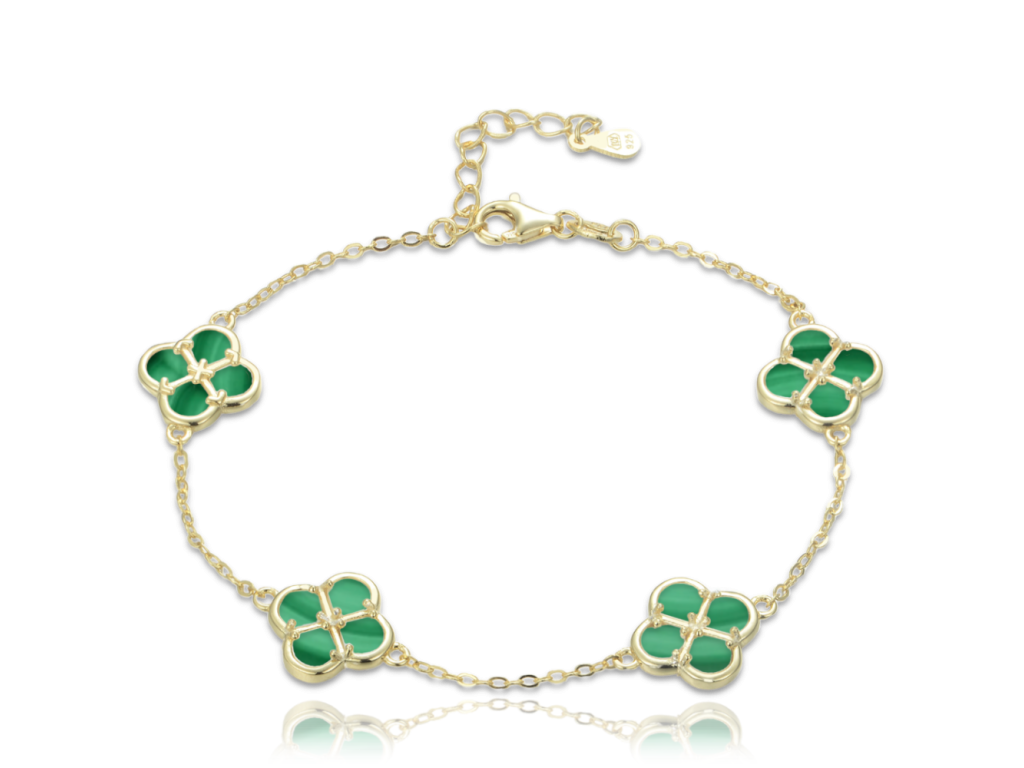 MINET Pozlacený stříbrný náramek čtyřlístky s malachitem