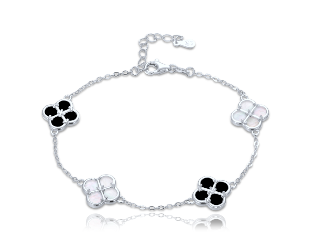 MINET Stříbrný náramek čtyřlístky s bílou a černou perletí