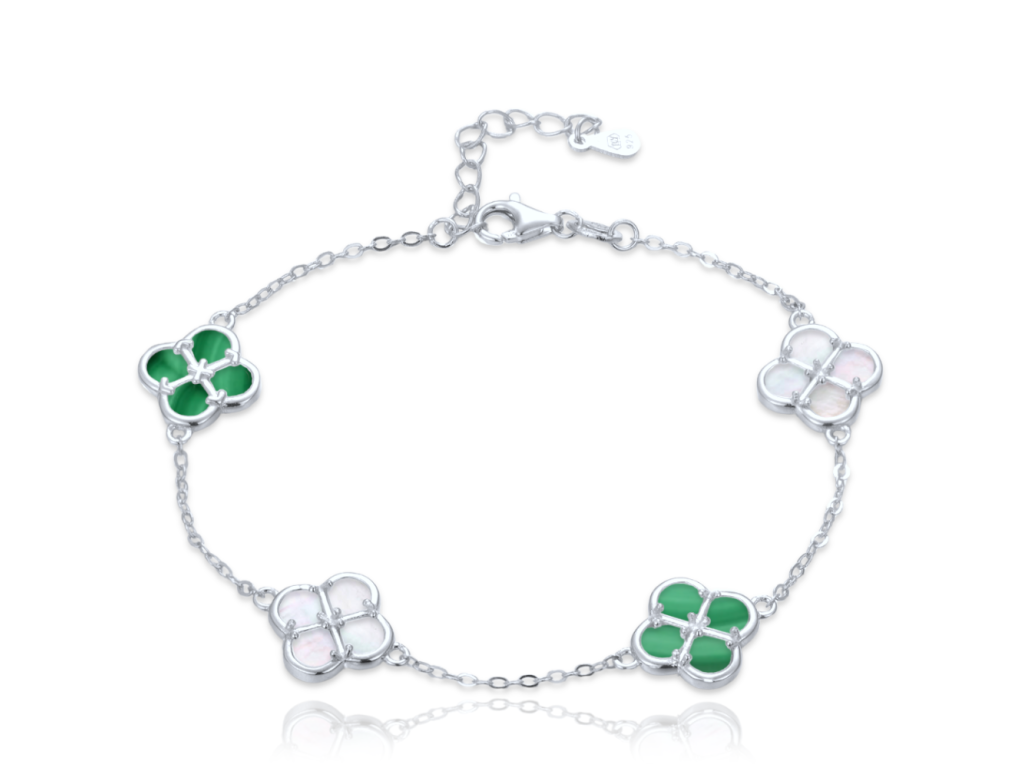 MINET Stříbrný náramek čtyřlístky s bílou perletí a malachitem
