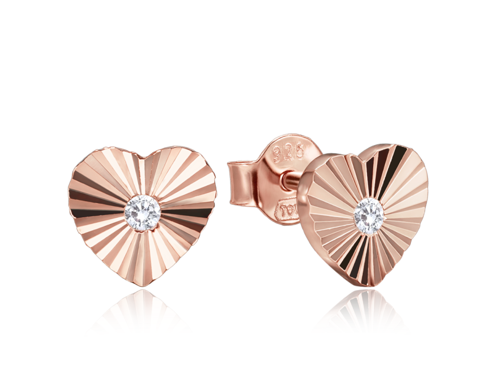 Rosegold stříbrné náušnice MINET se srdíčky a zirkony jsou vyrobeny ze stříbra Ag 925/1000, pokovené vrstvou růžového zlata a chráněné e-coatingem. Puzetové zapínání umožňuje pohodlné a bezpečné nošení. Decentní motiv působí jemně a hodí se k běžnému i slavnostnímu outfitu.Doplňkové parametry