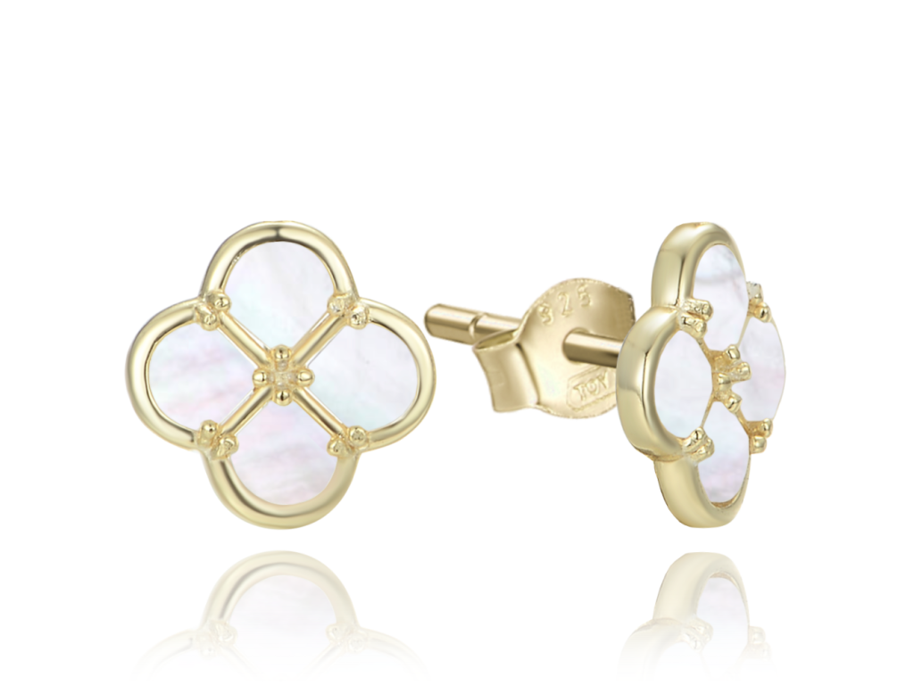 MINET Pozlacené stříbrné náušnice čtyřlístky s bílou perletí