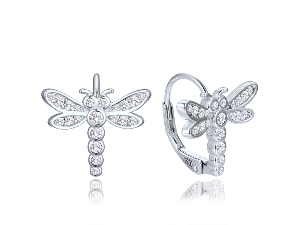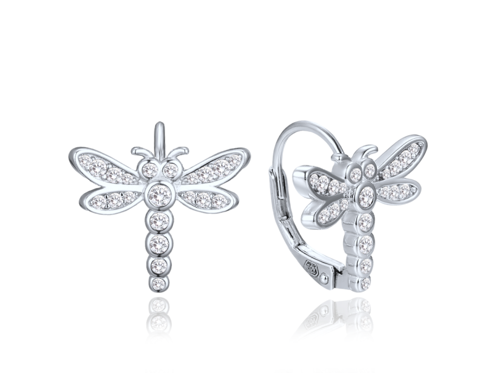 Stříbrné dětské náušnice MINET jsou vyrobeny z pravého rhodiovaného stříbra Ag 925/1000, které si dlouho udrží svou barvu i lesk. Mají motiv vážky a jsou zdobeny bílými zirkony. Zapínání je řešeno patentem pro bezpečné nošení.Doplňkové parametry