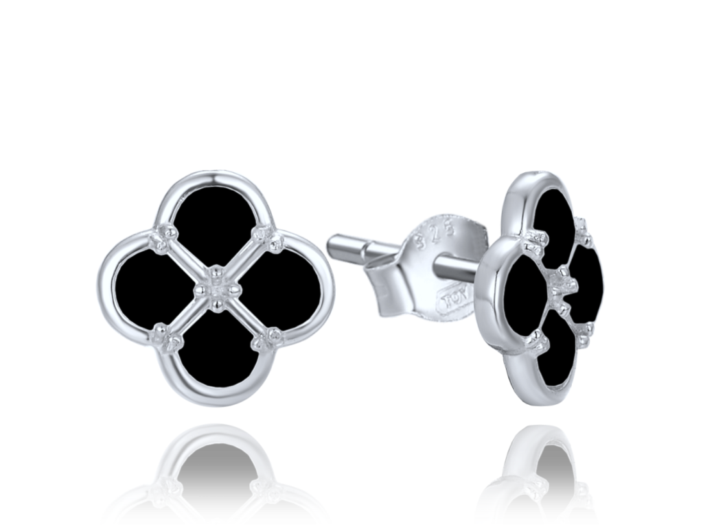 MINET Stříbrné náušnice čtyřlístky s černou perletí