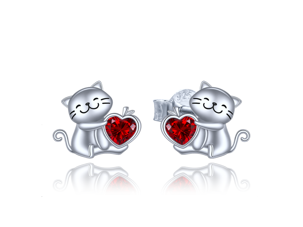 MINET Stříbrné náušnice kočky se srdíčkem s červenými zirkony