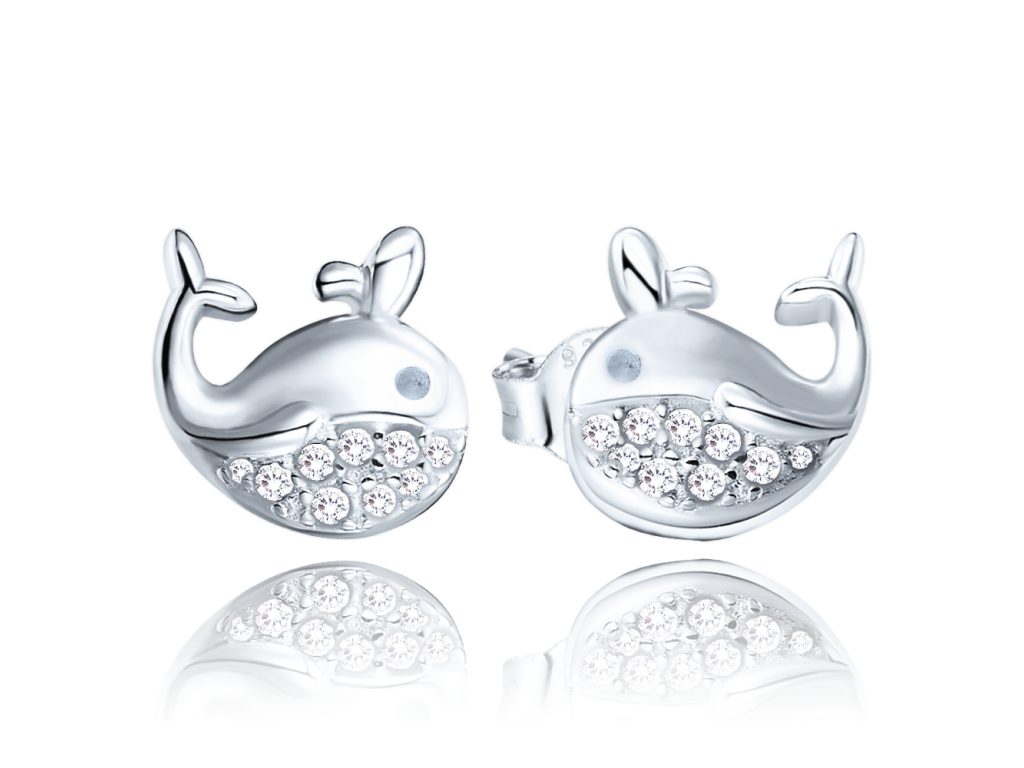 MINET Stříbrné náušnice VELRYBY s bílými zirkony
