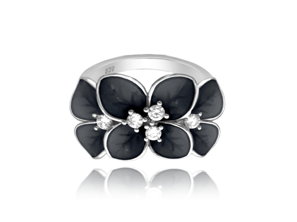MINET Černý rozkvetlý stříbrný prsten FLOWERS s bílými zirkony vel. 49